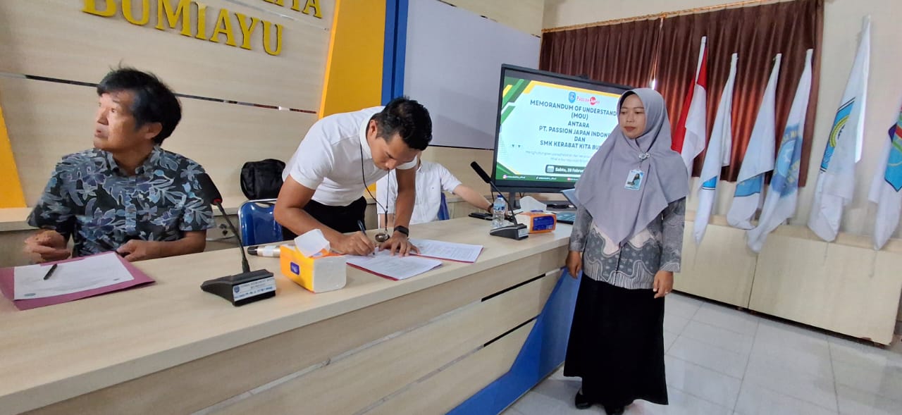 Rangkaian kegiatan kemudian dilanjutkan di Aula Kampus 2 dengan agenda utama, yaitu penandatanganan MoU antara PT Passion Japan Indonesia dan SMK Kerabat Kita Bumiayu. Penandatanganan ini menandai resmi terjalinnya kerja sama strategis dalam bidang penyaluran tenaga kerja, pelatihan, serta pembekalan kompetensi siswa sesuai kebutuhan industri Jepang.